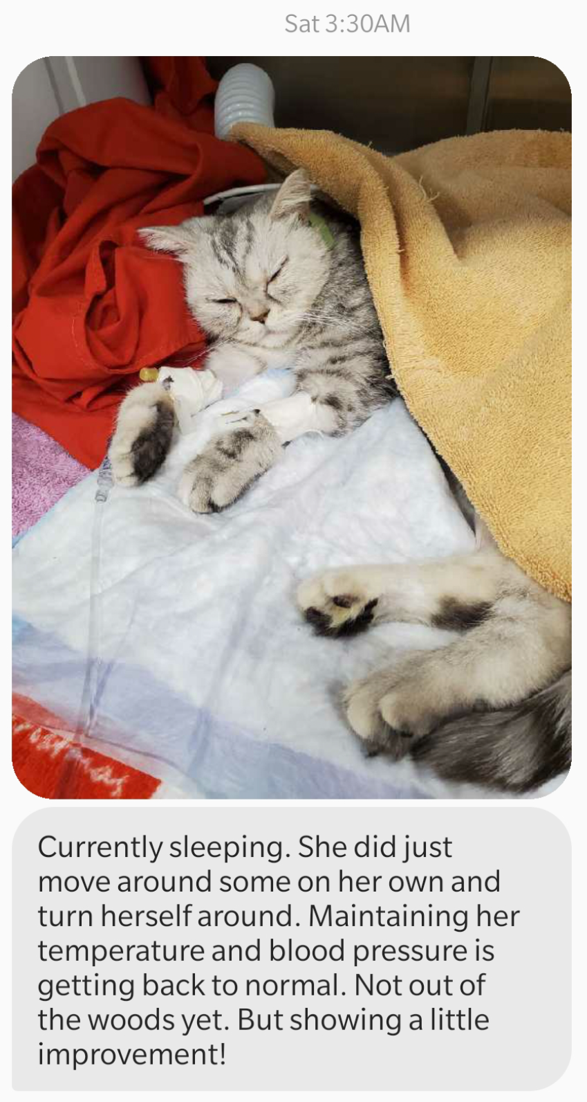 At first, Nebula seemed to be recovering well. She was alert, walking, and urinating on her own. But later that night, she was given a blood transfusion, and within hours, her condition deteriorated rapidly. She became pale, limp, and unresponsive. Dr. Jackson suspected “some vascular event that possibly could be a reaction to the transfusion.” I was extremely concerned about the donor blood used in the transfusion (learn more). I asked Dr. Jackson to halt all treatments and allow Nebula to recover on her own. I also made it clear that I wanted to be consulted for approval before any further treatments, especially blood transfusions. He agreed.